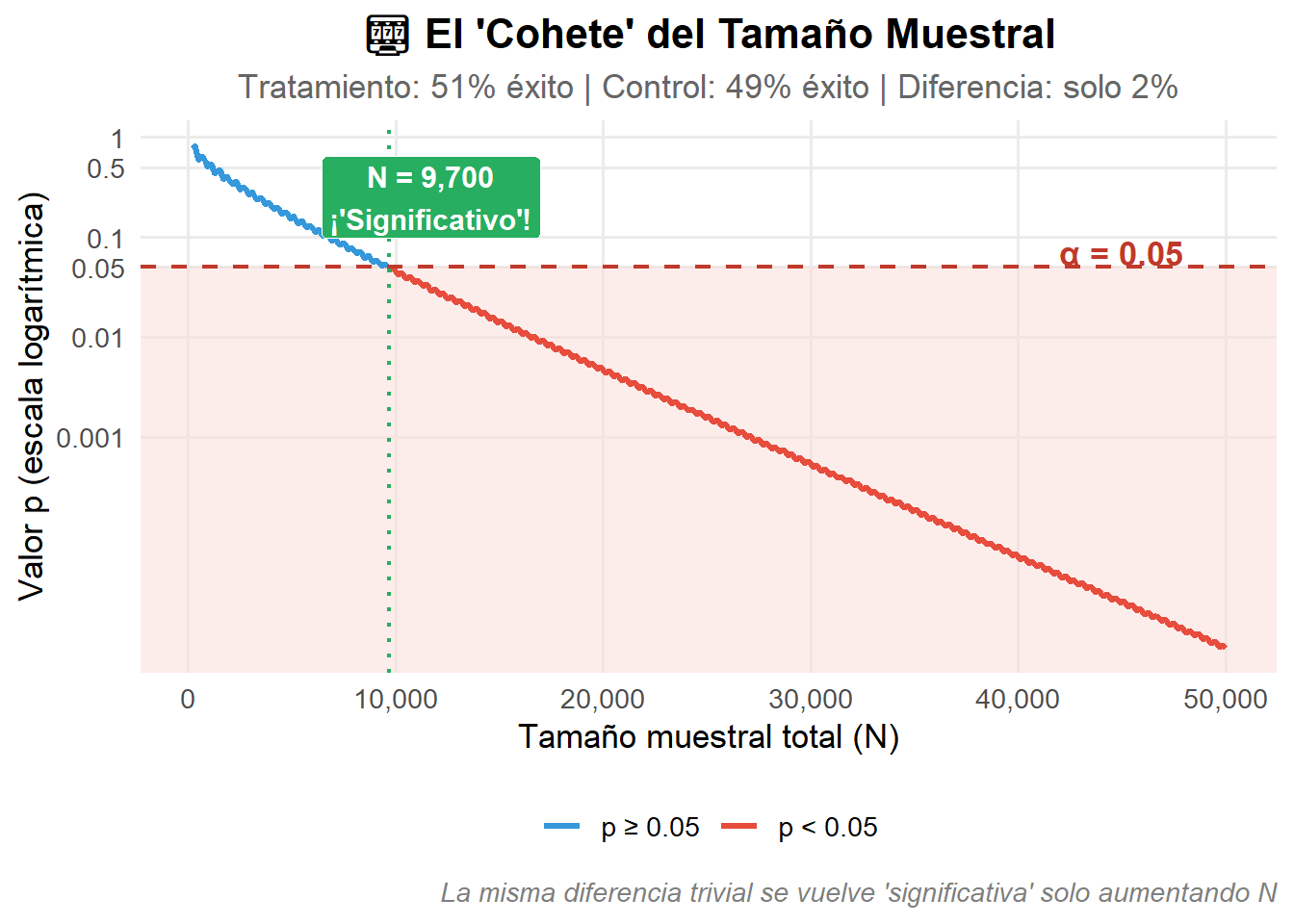 Este gráfico revela una verdad incómoda: la significación estadística es, en gran medida, una función del presupuesto de investigación. Con recursos suficientes para reclutar participantes, cualquier diferencia —por trivial que sea— puede cruzar el umbral mágico del p < 0.05.