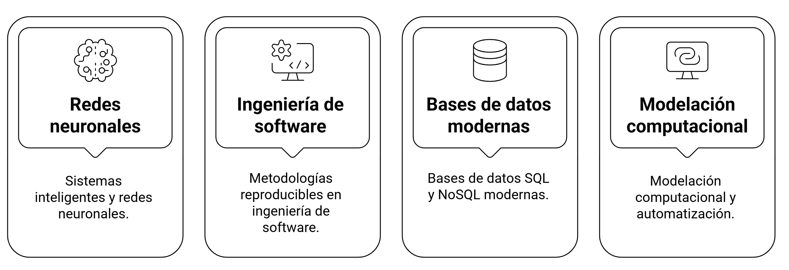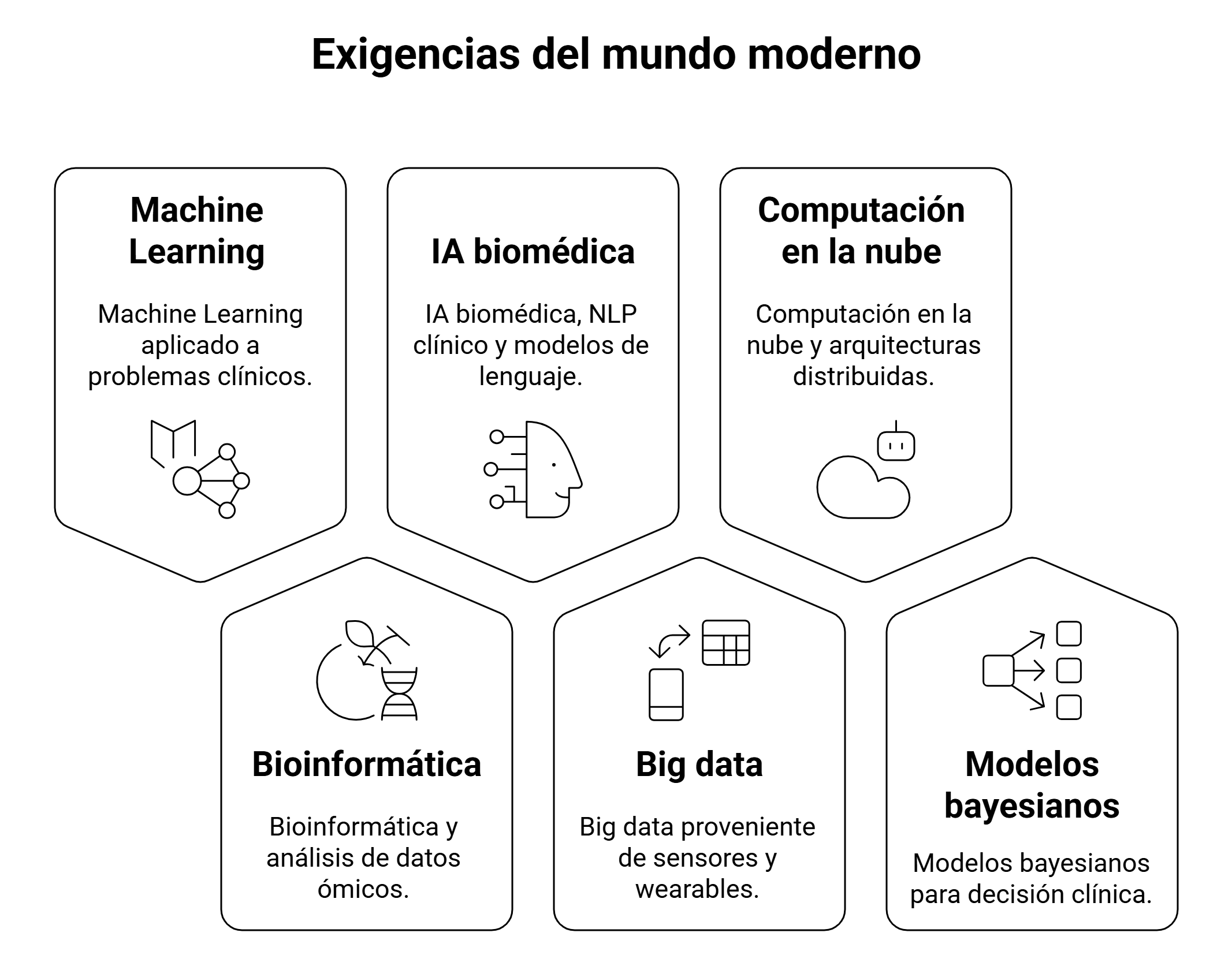 | Computación y Herramientas Analíticas | Herramientas informáticas; Organización y procesamiento de información; Gestión de información. | Programación aplicada; Computación científica; Ciencia de datos; Bioinformática; Manejo de información biomédica. | Programación estadística; Minería de datos; Manejo de bases de datos biomédicas complejas. | Programación avanzada; Computación en la nube; Sistemas distribuidos; Infraestructura digital para datos de salud. |