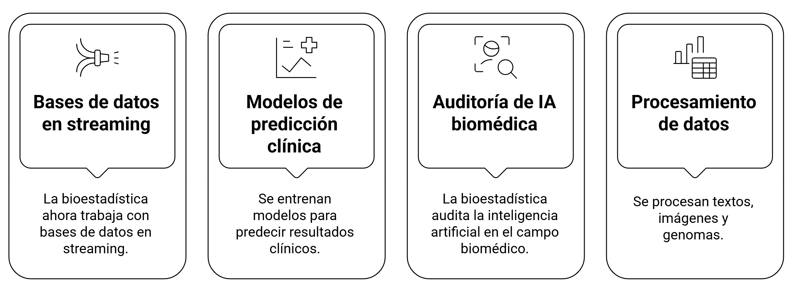| Modelos Predictivos | Regresión lineal; Regresión logística; Métodos multivariados. | Métodos predictivos; Aprendizaje supervisado; Aprendizaje profundo aplicado a biología y salud. | Métodos predictivos con enfoque causal; Aprendizaje estadístico aplicado a datos de salud. | Métodos predictivos para datos de gran escala; Analítica poblacional; Aprendizaje automático aplicado a datos masivos. |
